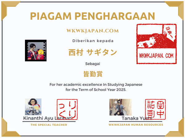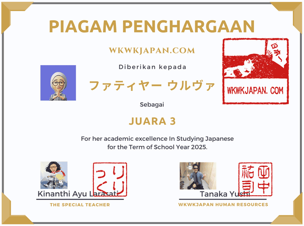 Kon'nichiwa, teman-teman~. Tahun 2025 juga kita belajar bahasa Jepang bersama di kursus bahasa Jepang online by wkwkjapan setiap hari secara kontinu dan konsisten, dan akhirnya kemarin semua program selesai dengan baik. みなさん、おつかれさまでした!