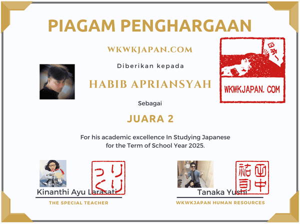Juara 1 おめでとうございます。Kamu adalah paling nomor satu dari 93.412 anggota di grup wkwkjapan tahun 2025. Prestasimu selama ini tidak diragukan lagi dari sisi kehadiran, nilai mini tes, keaktifan baik di facebook maupun telegram. Selain itu, kamu bisa bertanya2 tentang apa yang belum kamu ketahui, padalah kebanyakan peserta tahun ini kurang banyak melakukan “tanya-jawab”.