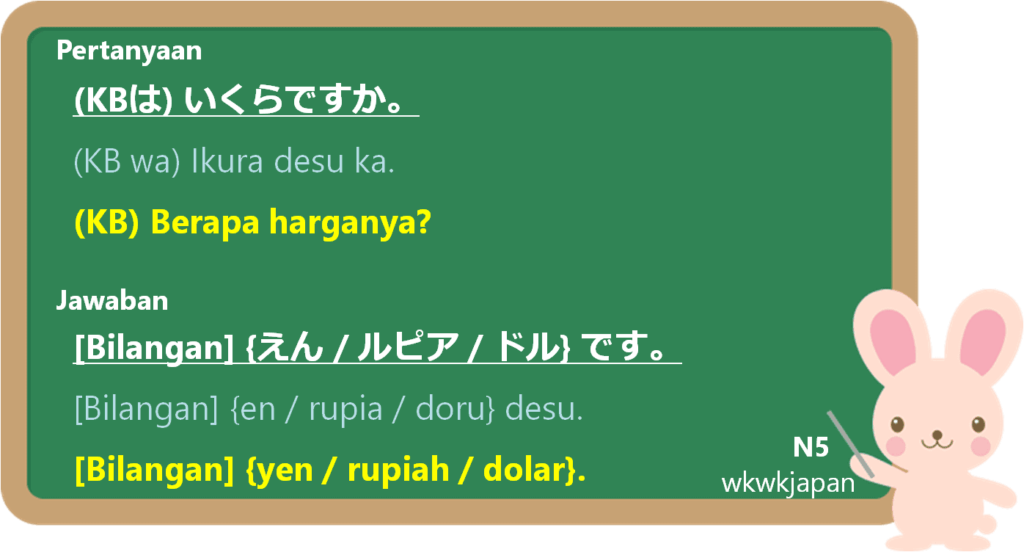 Pola kalimat di atas digunakan untuk menanyakan dan menyatakan harga (dari KB). Kata tanya “ikura” memiliki makna “berapa”. Jawabannya cukup “bilangan + {mata uang} desu” saja, tidak perlu lagi bagian “KB wa”.