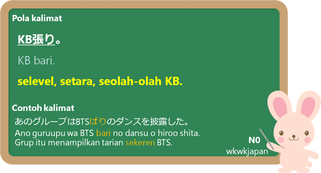 Akhiran 張り (bari) ditambahkan pada bagian belakang nama orang atau kata benda (KB) untuk menunjukkan sesuatu yang mirip, setara, atau seakan-akan orang atau kata benda (KB) tersebut. Biasanya, ekspresi ini digunakan tidak hanya menyatakan “kemiripan”, tetapi juga mengandung nuansa bahwa sesuatu tersebut memiliki kualitas, intensitas, atau kemampuan yang bersaing atau menyaingi orang kata benda tersebut. Ada rasa "kekaguman" atau penekanan pada tingkatan yang tinggi (atau ekstrem).