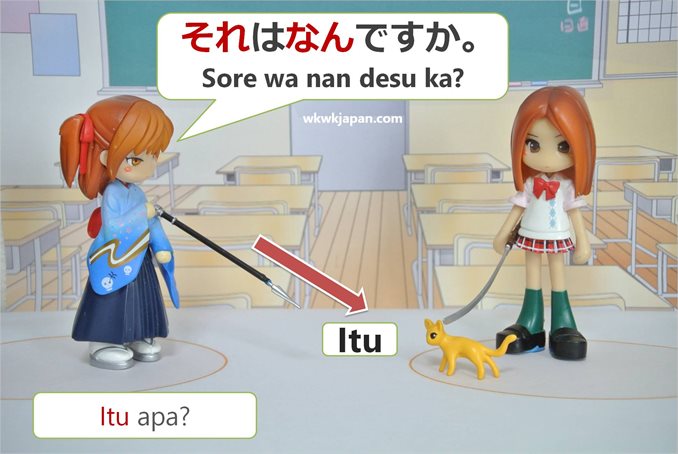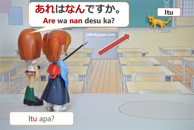 Kalimat tanya “{Kore / sore / are} wa nan desu ka” digunakan untuk menanyakan apa (benda) yang ditunjukkan oleh pembicara. Kata tanya “nan” yang artinya “apa” diletakkan pada posisi “KB2” dalam pola kalimat “KB1 wa KB2 desu ka”,  sedangkan “kore / sore / are” yang dilektakkan pada posisi “KB1” adalah kata penunjuk, sekaligus topik (subjek) untuk menunjukkan suatu benda.
