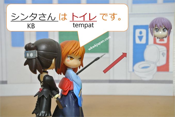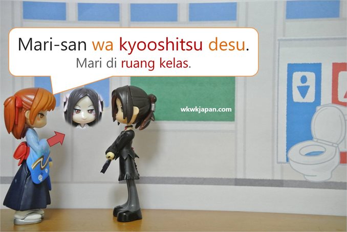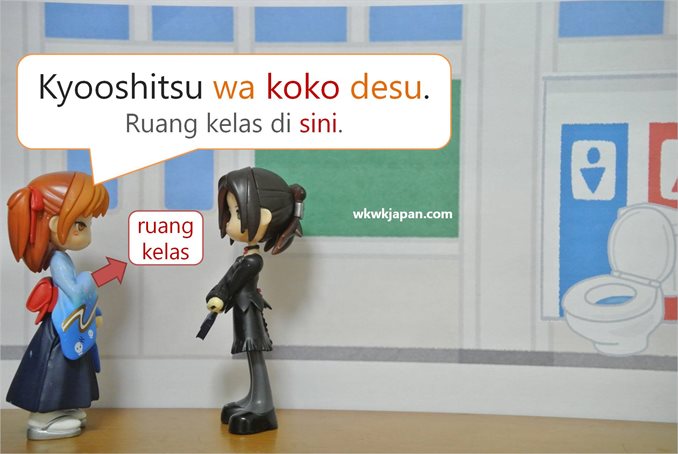 Pola kalimat ini digunakan untuk menyatakan tempat benda/orang/tempat berada. Kata penunjuk “koko, soko, asoko” atau “kochira, sochira, achira” maupun kata benda yang menyatakan tempat seperti sekolah, kantor, bangunan, dsb dapat ditempatkan dalam bagian “[tempat]”.