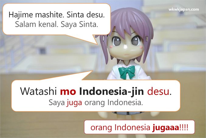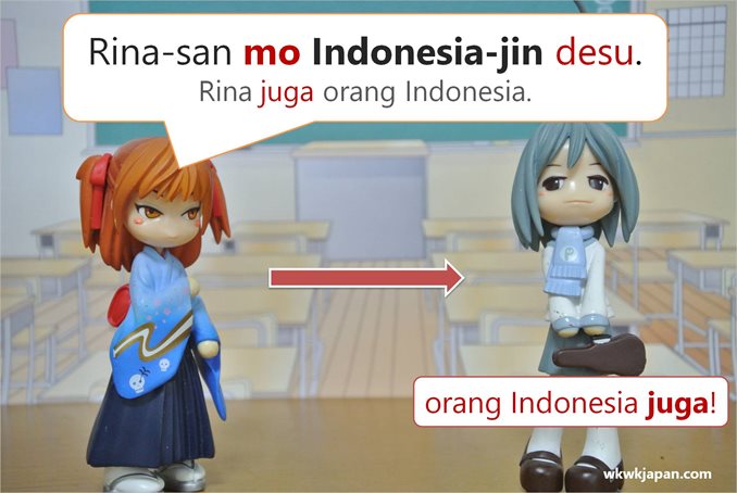 Oleh karena itu, “Mo” dapat diterjemahkan sebagai “juga” dalam bahasa Indonesia. Namun,  hati-hati,  partikel “mo” ini harus disertai dengan predikat (KB2), sehingga tidak dapat diucapkan seperti “kon'nichiwa mo”  untuk menyatakan “selamat siang juga” karena tidak terdapat predikat dalam ucapan “kon'nichiwa”. Jadi, penggunaan “mo” dalam bahasa Jepang sedikit beda ya dengan “juga” dalam bahasa Indonesia!  🙂
