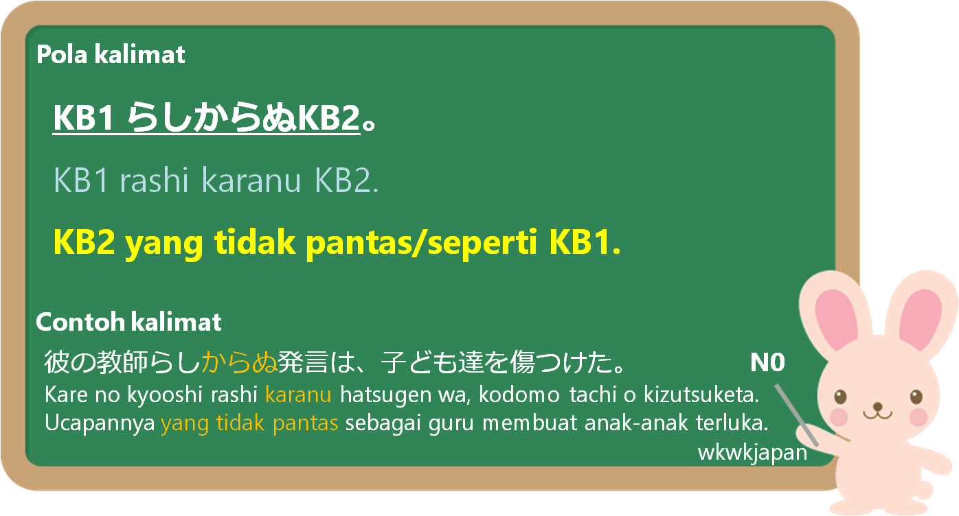 らしからぬ (rashi karanu) adalah bahasa kuno untuk membentuk bentuk negatif dari らしい yang menerangkan sifat, karakter, atau keadaan seseorang yang pantas atau tipe sekali.