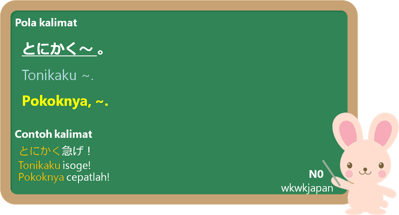 Kata keterangan とにかく (tonikaku) digunakan untuk menekankan suatu poin yang paling penting, diutamakan, atau terlebih dahulu, terlepas dari berbagai hal lain.