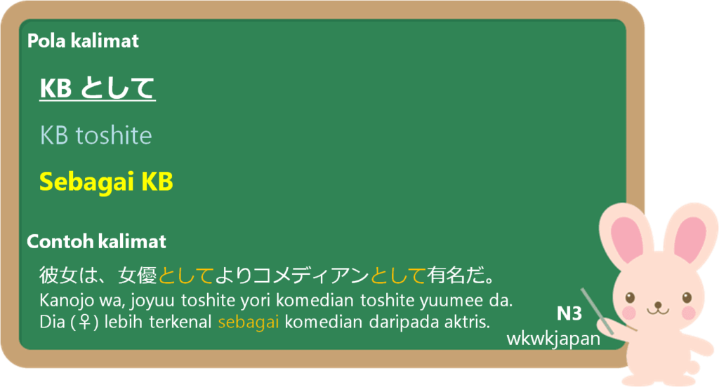 Jika ingin menerangkan sebuah kata benda (KB2) dengan frasa “KB1 toshite (sebagai KB1)”, sambungkanlah “KB1 toshite” dan KB2 tersebut dengan partikel “no”.