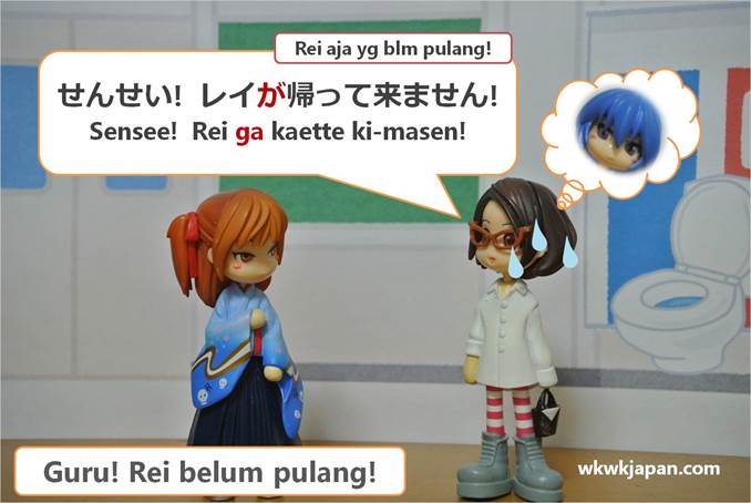 *Rei yang seharusnya pulang (krn semua teman2 di sekolah sudah pulang ke rumah ) belum pulang. Rei adalah informasi baru. Ibu Rei menunjukkan Rei dengan partikel “ga”.