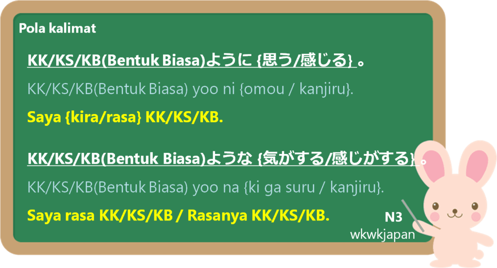 Jika “KK/KS/KB + ように” disambung dengan kata kerja 思う (berpikir / mengira) atau 感じる (merasa), kalimat ini menunjukkan perasaan, dugaan, atau pendapat pembicara secara subjektif tetapi lembut dan tidak langsung.
